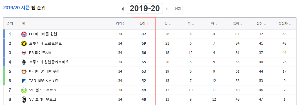 2019~2020 분데스리가 순위(2020년 7월 7일 현재)2019-20 분데스리가 순위(출처: 네이버)