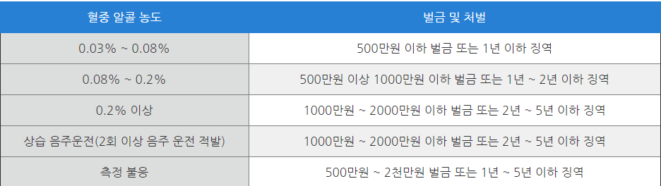 아래 음주로 인한 처벌 기준 확인하시기 바랍니다.