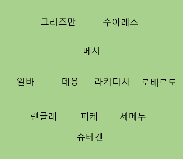 메시가 전통적인 10번 역할을 맡고 그리즈만과 수아레즈가 포워드 겸 윙어 역할을 수행합니다.