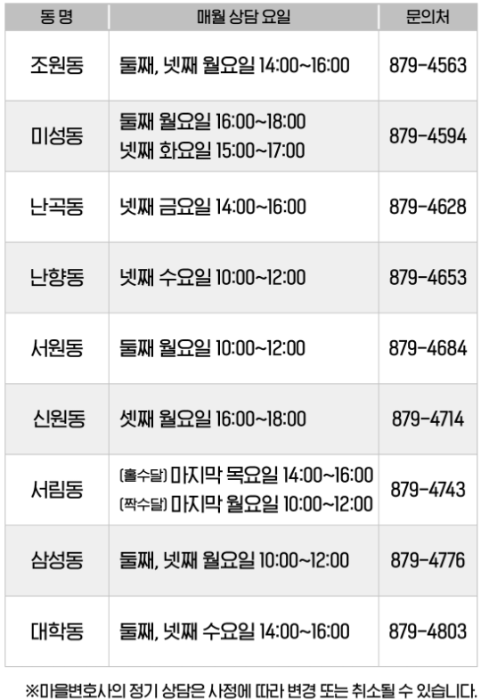 각 구마다 상담일과 상담실 위치가 다르므로, 미리 동 주민센터를 통해 상담을 접수하신 뒤 이용하시면 됩니다.