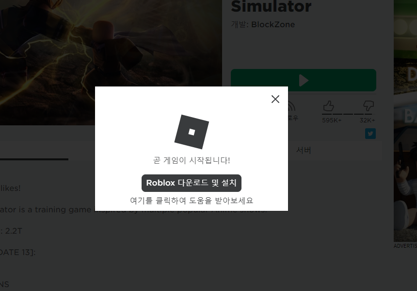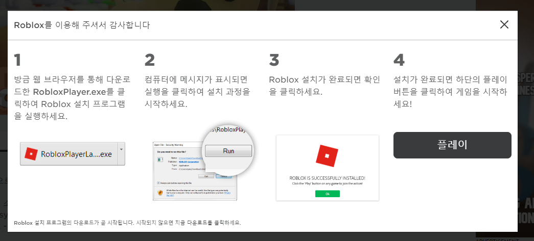 바로 위와 같은 로블록스 플레이어 설치 안내가 나옵니다.