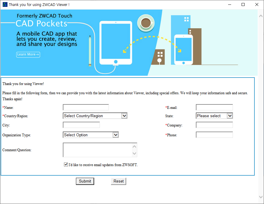 zwcad 설치 후, 정보 적는 팝업이 나오는데, 정보 제공 안하실 것이면 x 눌러서 끄면 됩니다.