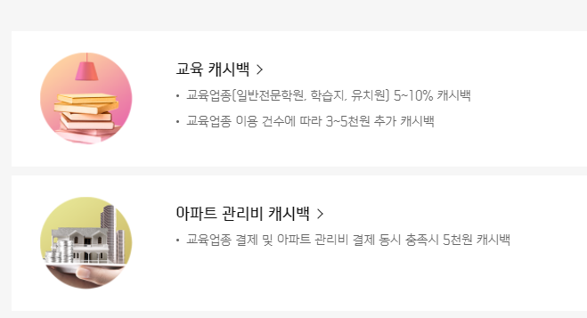 그런데 교육업종 결제와 아파트 관리비 결제를 동시에 하는 경우 5천원 캐시백을 해줍니다.